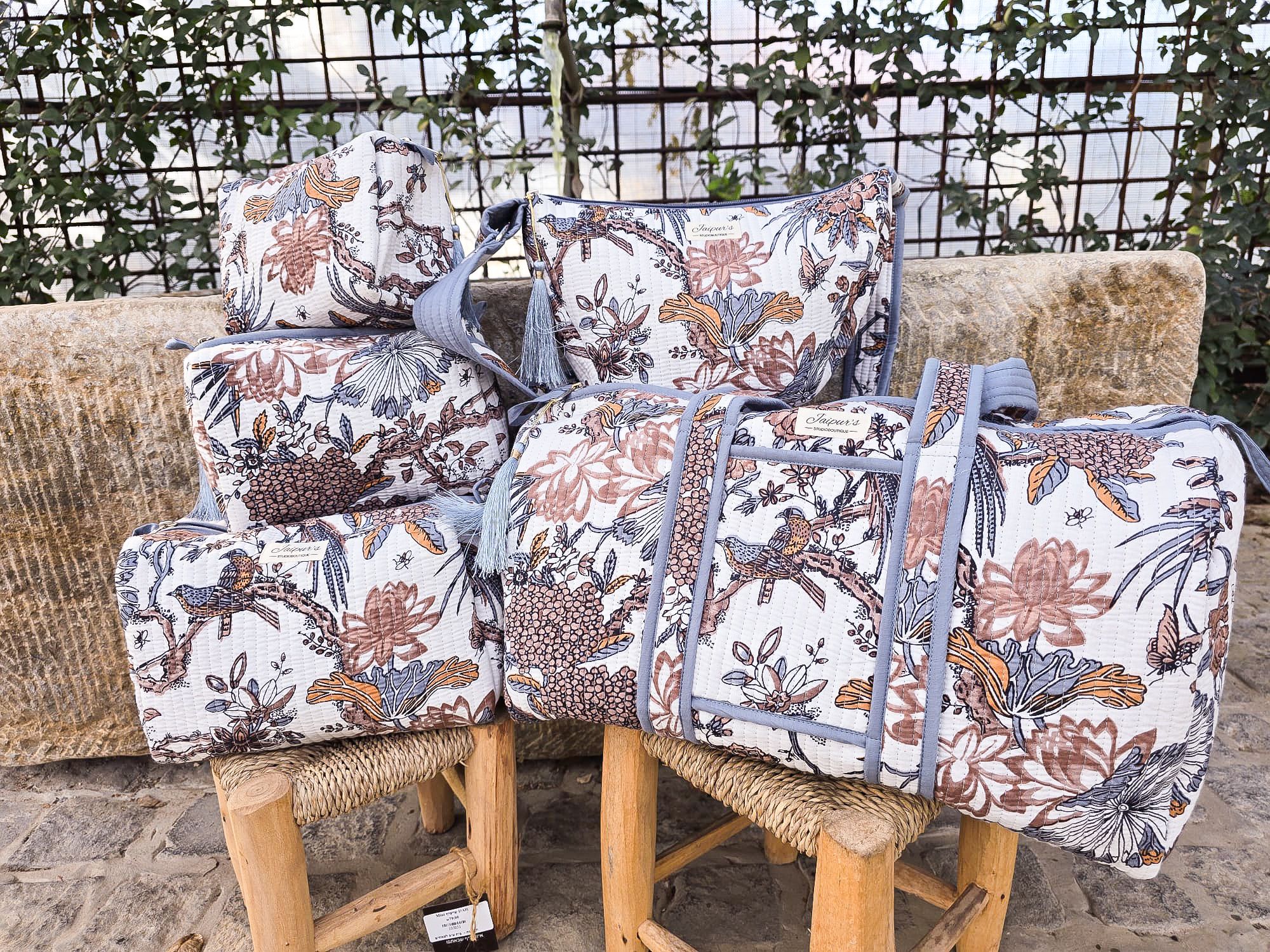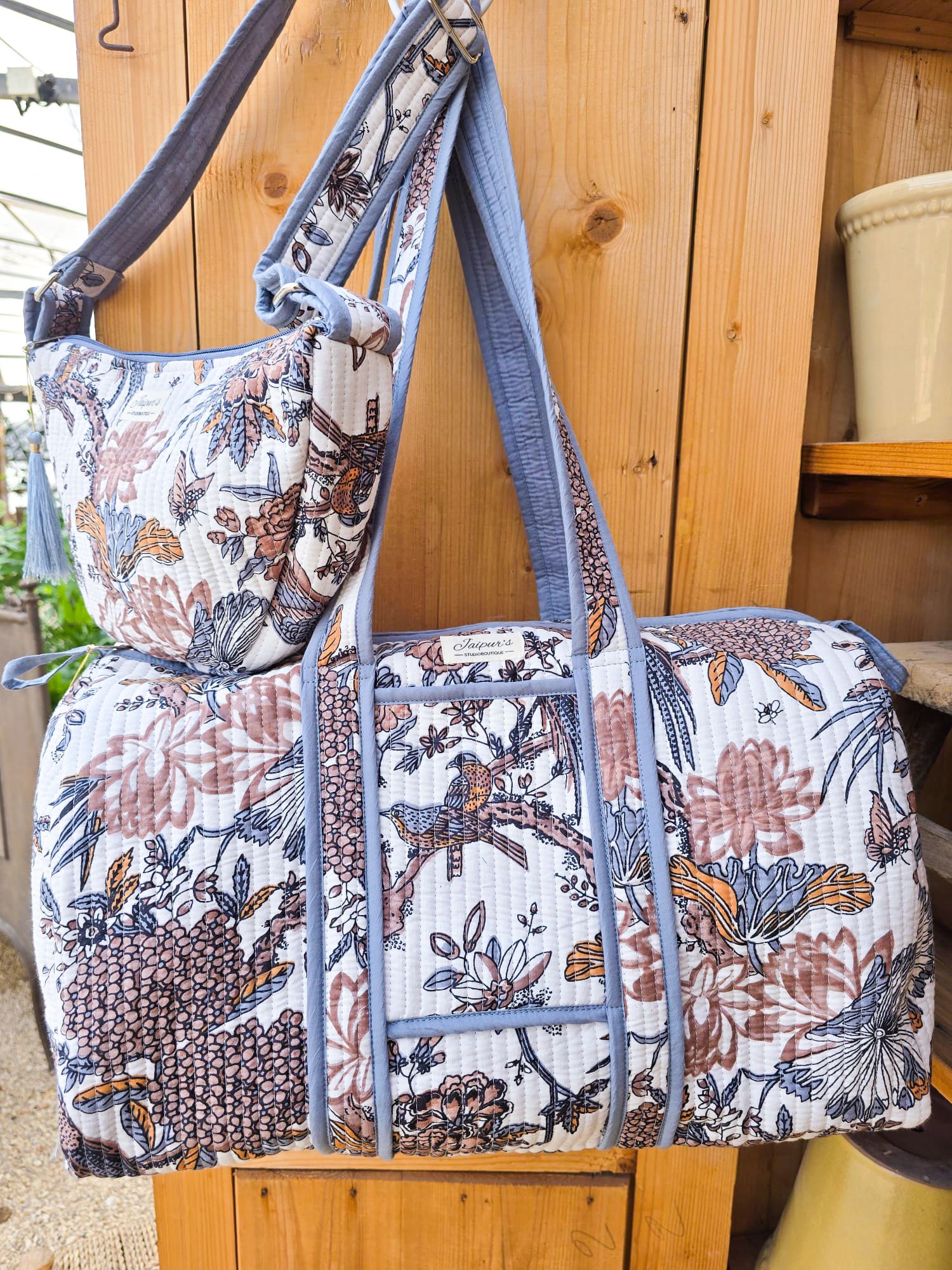 תיק דפל מרופד זה מעוטר בדוגמה עדינה של ציפורים ואלמנטים בוטניים, בהדפס בלוק ידני מסורתי. הציפורים משתלבות בענפים ועלים מעוצבים, בגוונים רכים וטבעיים, על רקע לבן נקי ומרגיע, היוצר מראה הרמוני, אלגנטי ומלא חן.