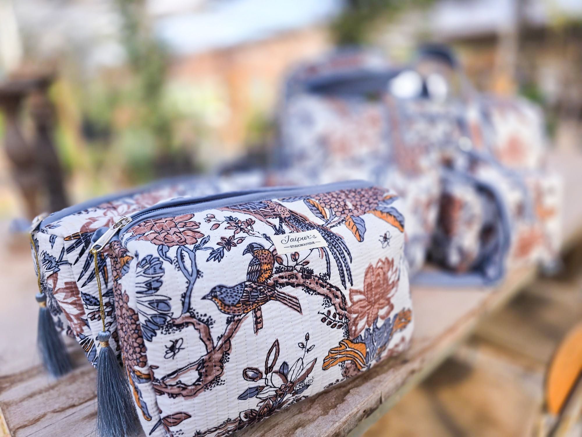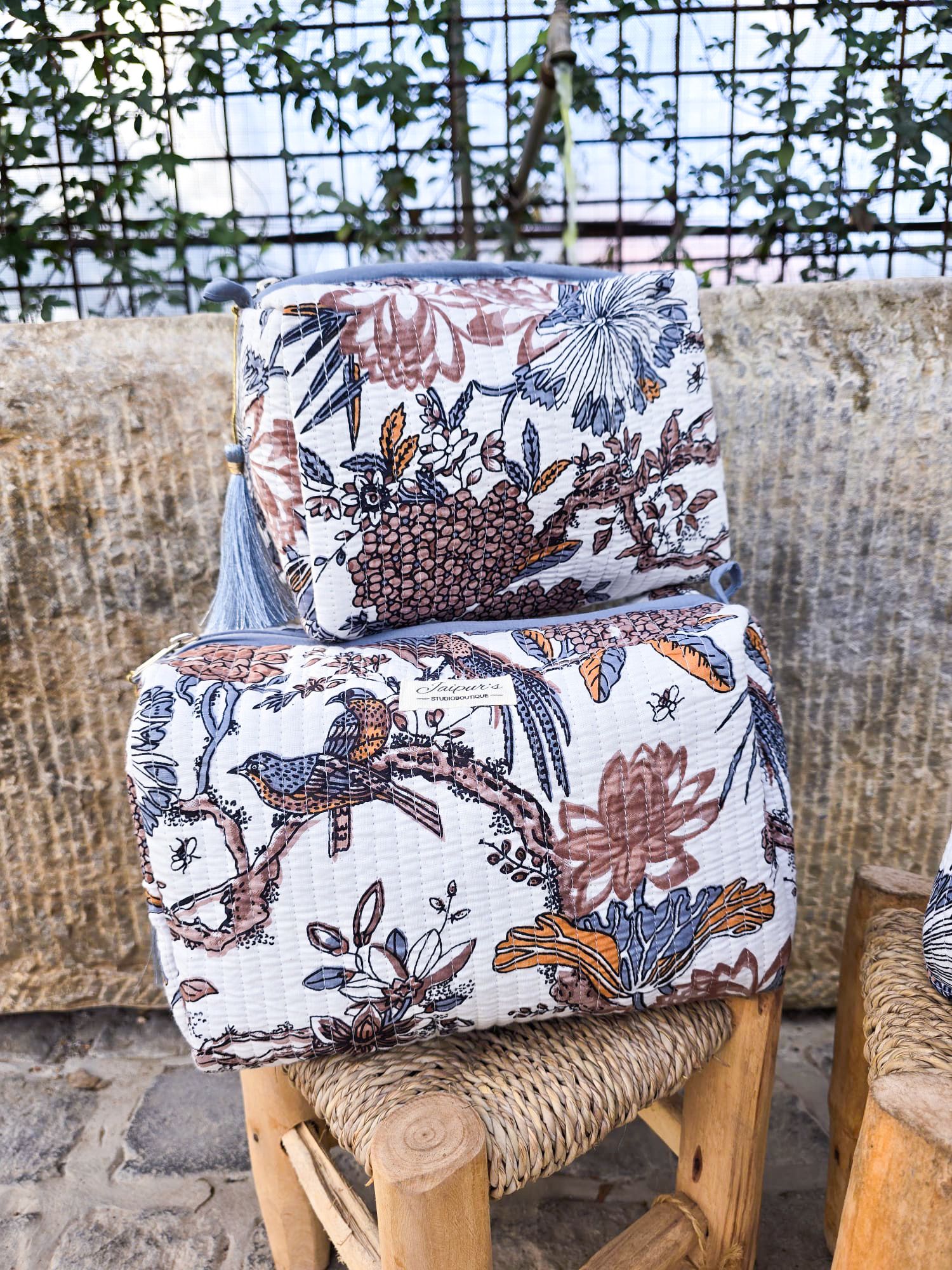 תיק רחצה מרופד זה מעוטר בדוגמה עדינה של ציפורים ואלמנטים בוטניים, בהדפס בלוק ידני מסורתי. הציפורים משתלבות בענפים ועלים מעוצבים, בגוונים רכים וטבעיים, על רקע לבן נקי ומרגיע, היוצר מראה הרמוני, אלגנטי ומלא חן.