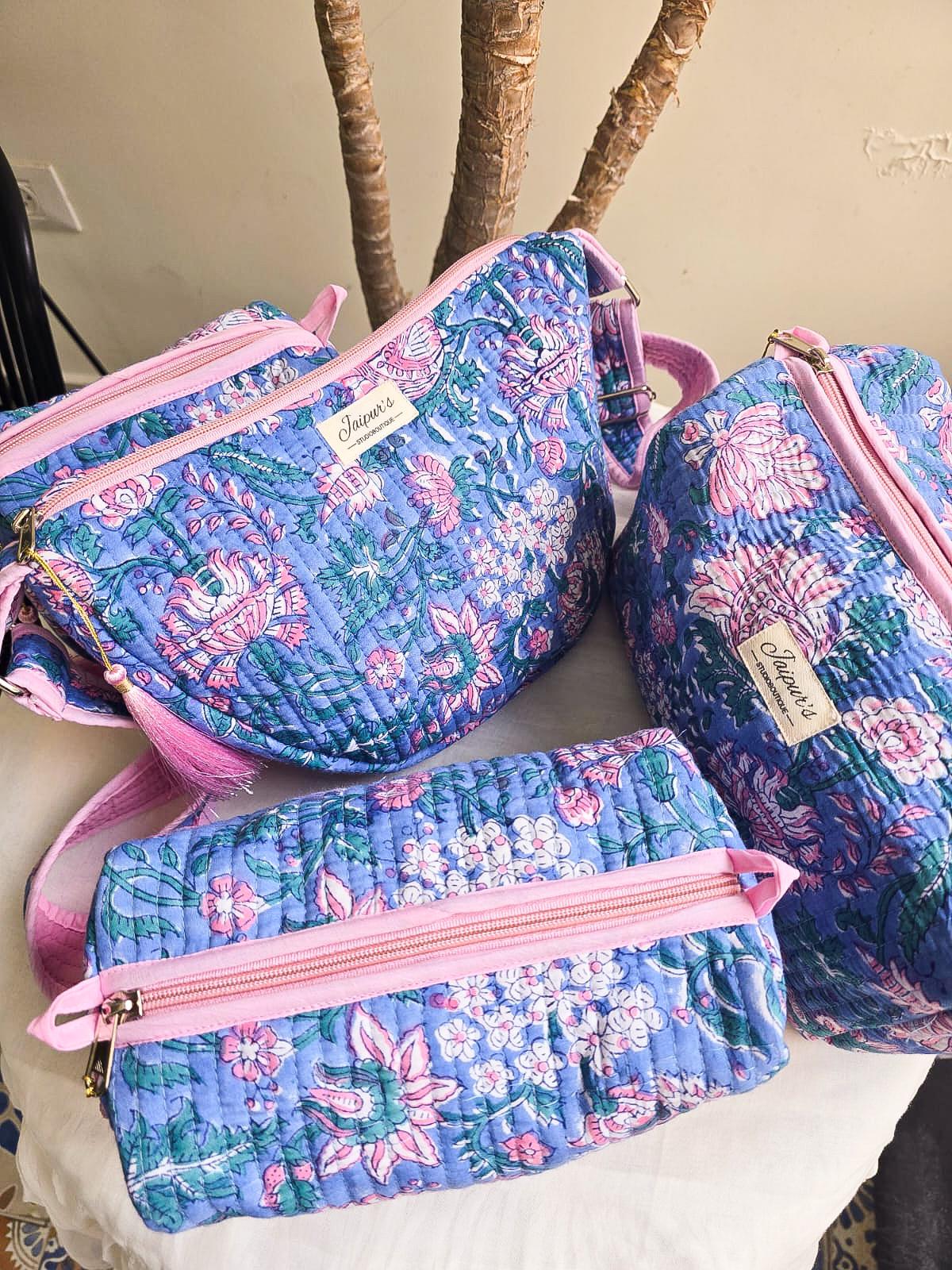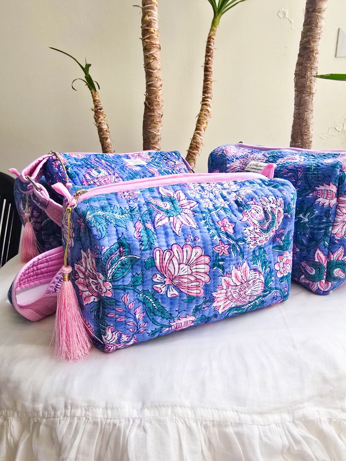 תיק רחצה מרופד בהדפס בלוק ידני מסורתי בדוגמה פרחונית עדינה עם פרחים גדולים בסגנון לוטוס בגווני ורוד ולבן. העלים והגבעולים הירוקים משתלבים בהרמוניה על רקע כחול