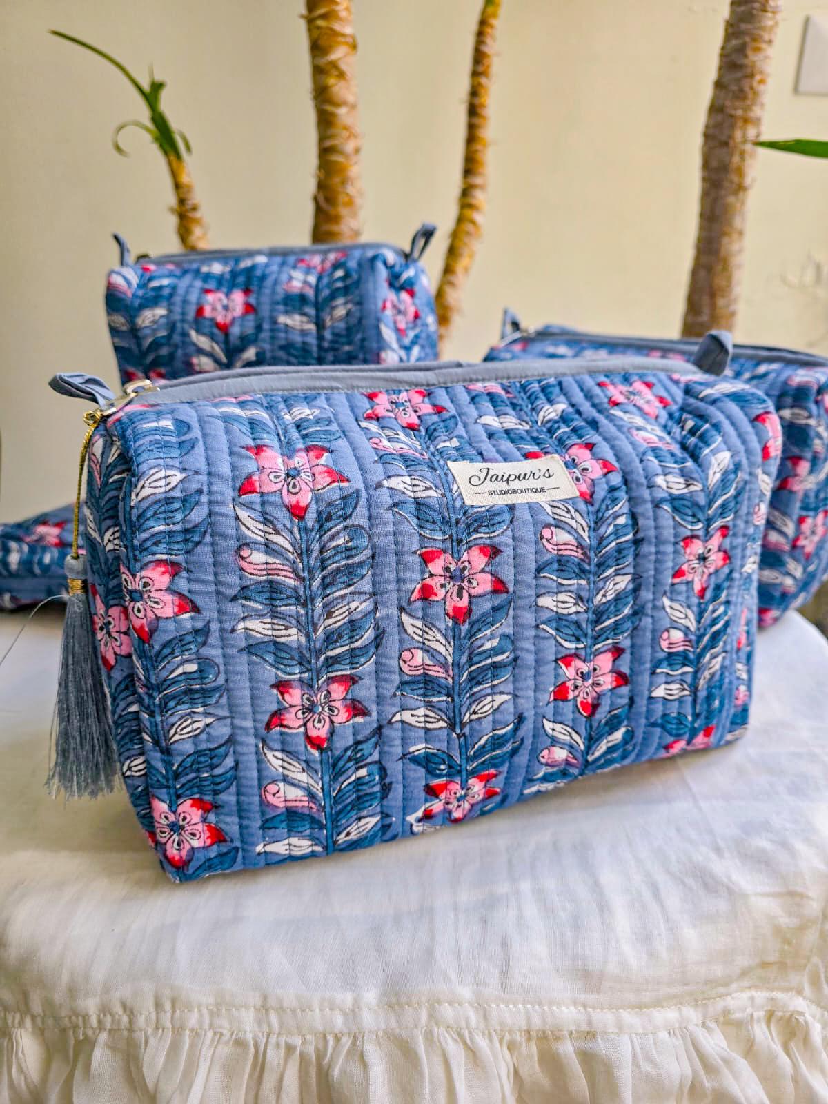 תיק רחצה מרופד עם הדפס פרחוני עשיר בהשראת הדפס בלוק ידני מסורתי, בגווני ורוד ואדום עם עלים ירקרקים על רקע כחול־אפור.