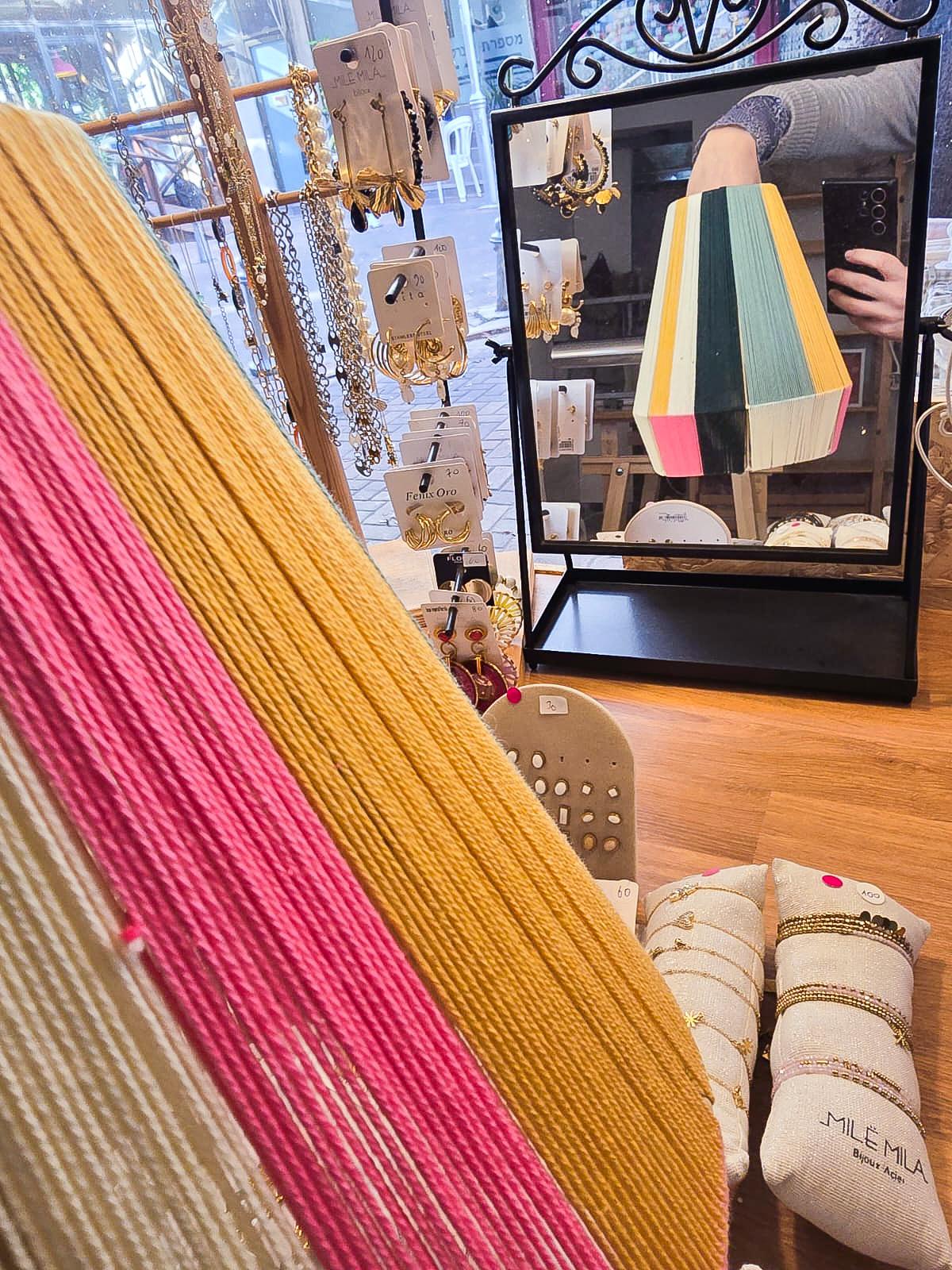 בואי ללמוד איך אורגים האיל בחוטי כותנה. כל אחד מקבלת מסגרת רקע ובוחרת את החוטי כותנה בצבעים שהיא רוצה כדי ליצור אותו בהתאמה לבית שלה.