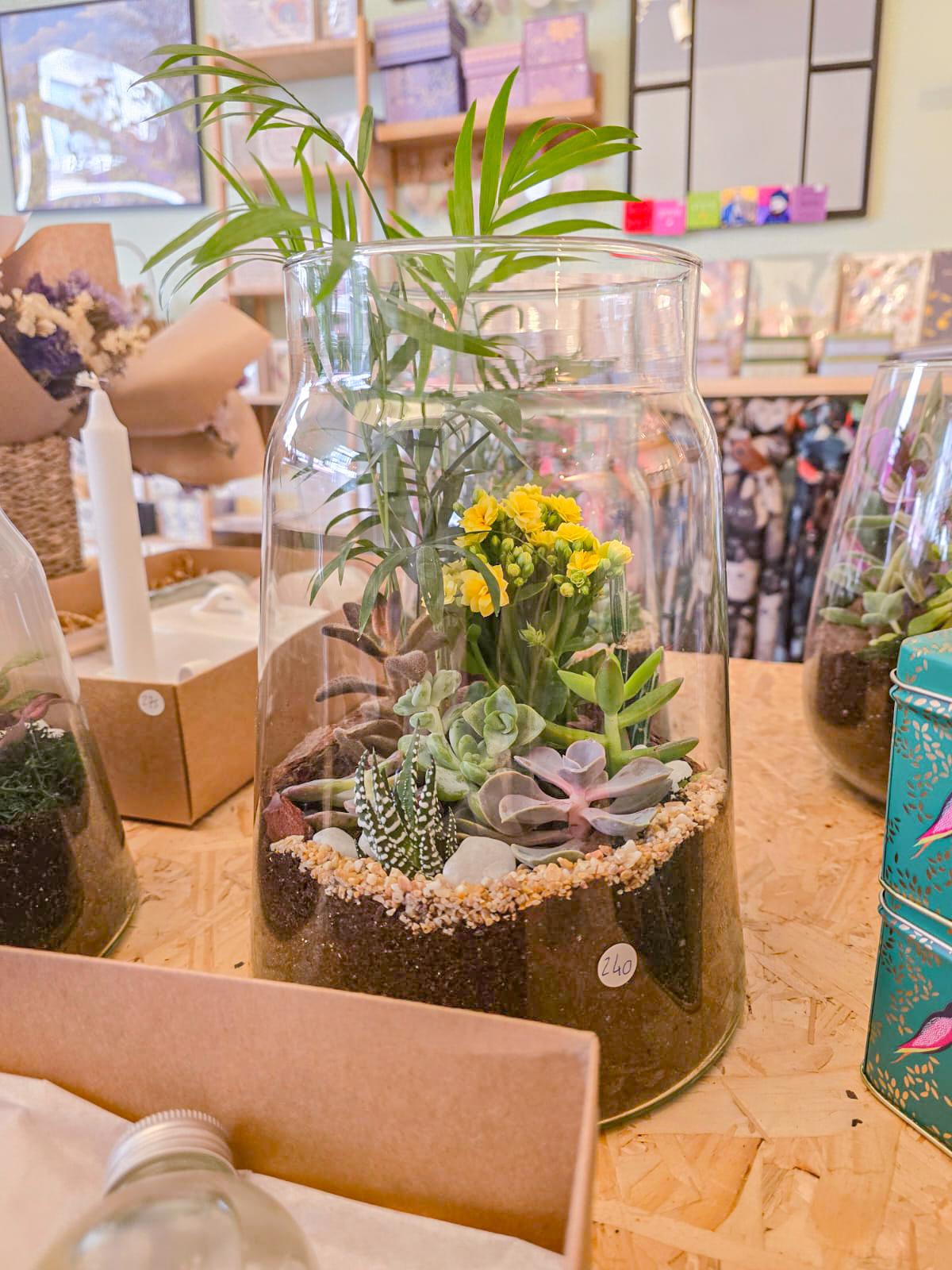 Terrariums are enclosed eco-systems for plants and moss (like an aquarium but for plants). The mini garden is unique in composition and acts as a mini-ecosystem. The plants and the soil in the terrarium release water vapor, this vapor is then collected onto the walls of the vessel and trickles down to the soil. Terrariums are self-nourishing, which is why they require little maintenance.